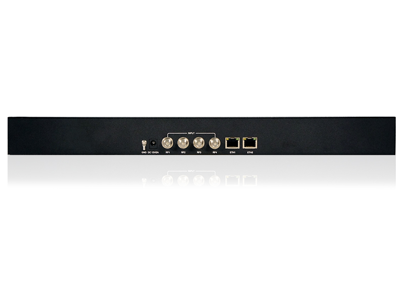 Цифровой ресивер MS-MD-47 предназначен для профессиональных систем видеораспределения и IPTV-сетей. Устройство оснащено четырьмя RF-входами (INPUT RF1-4) с гнездовыми разъёмами F-type для подключения DVB-T/DVB-T2 и DVB-C телевизионного сигнала. Поддержка режимов демодуляции DVB-T и DVB-C обеспечивает универсальность применения, а встроенные TUNER-модули выполняют анализ уровня и качества сигнала в реальном времени. Питание осуществляется от адаптера постоянного тока, управление — через веб-интерфейс.