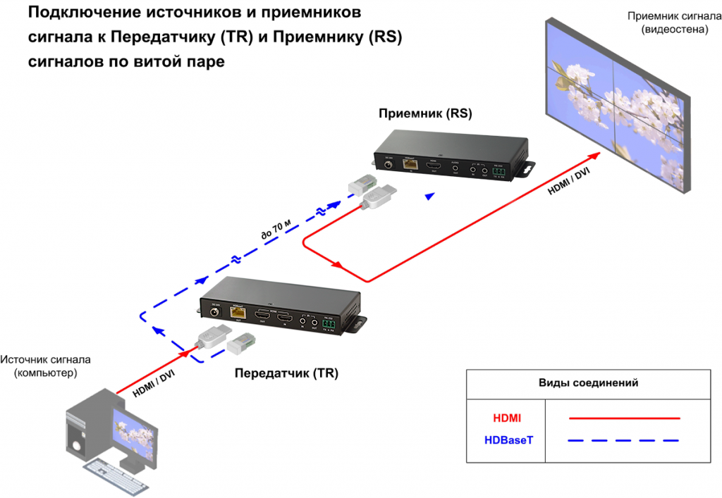 Передатчик преобразует сигналы HDMI, RS-232, Ethernet и ИК в сигнал витой пары. Приемник преобразует сигнал витой пары обратно в выходные сигналы HDMI, RS-232 и ИК.